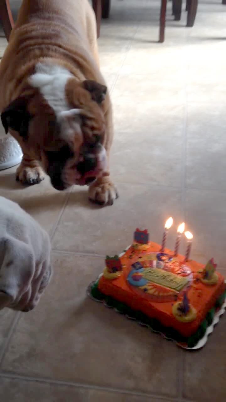 An English Bulldog dog licks at his birthday cake indoors while a woman sings "Happy birthday" and when she finishes, the dog blows out the candles.