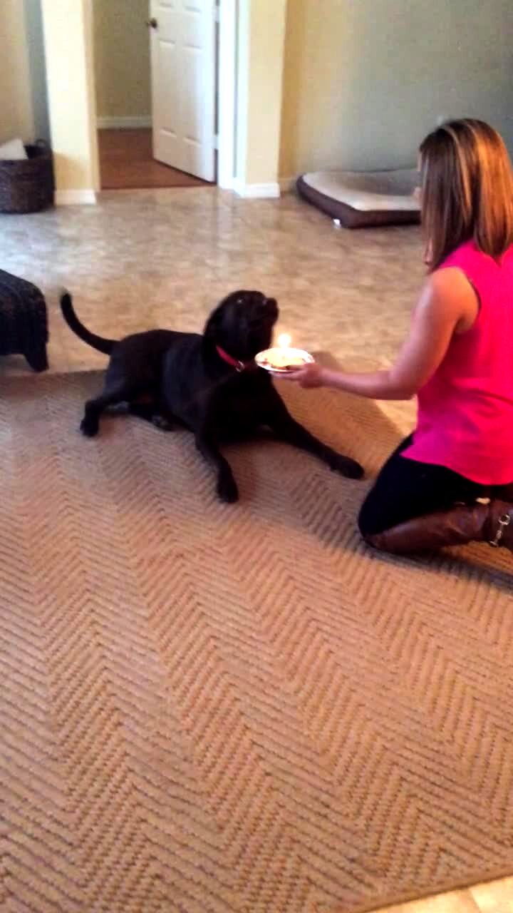 A woman sings "Happy Birthday" to a black dog indoors, holds a small cake with a candle in it up to the dog, and the dog knocks it out of her hand with its paw.