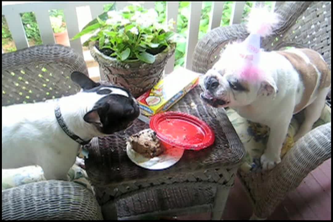 Animal birthday party. Boston Terrier and Bulldog growl at each other while sitting on wicker furniture, eating birthday cake. One dog wears a party hat.