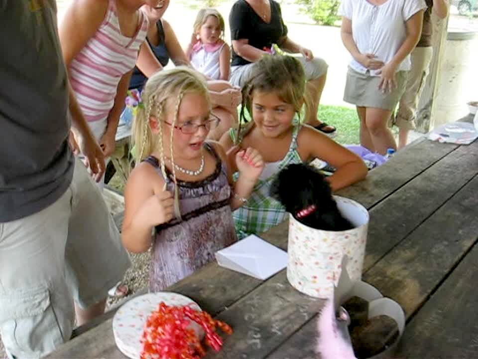 Girl opens birthday present at outdoor party a little puppy dog jumps out. Girl is surprised.