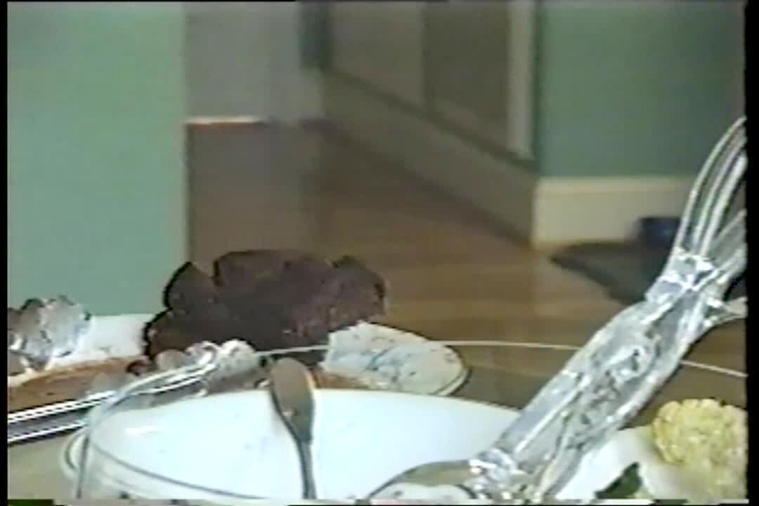 A woman brings a birthday cake out to a dining room, then she trips on a dog and falls forward hard.