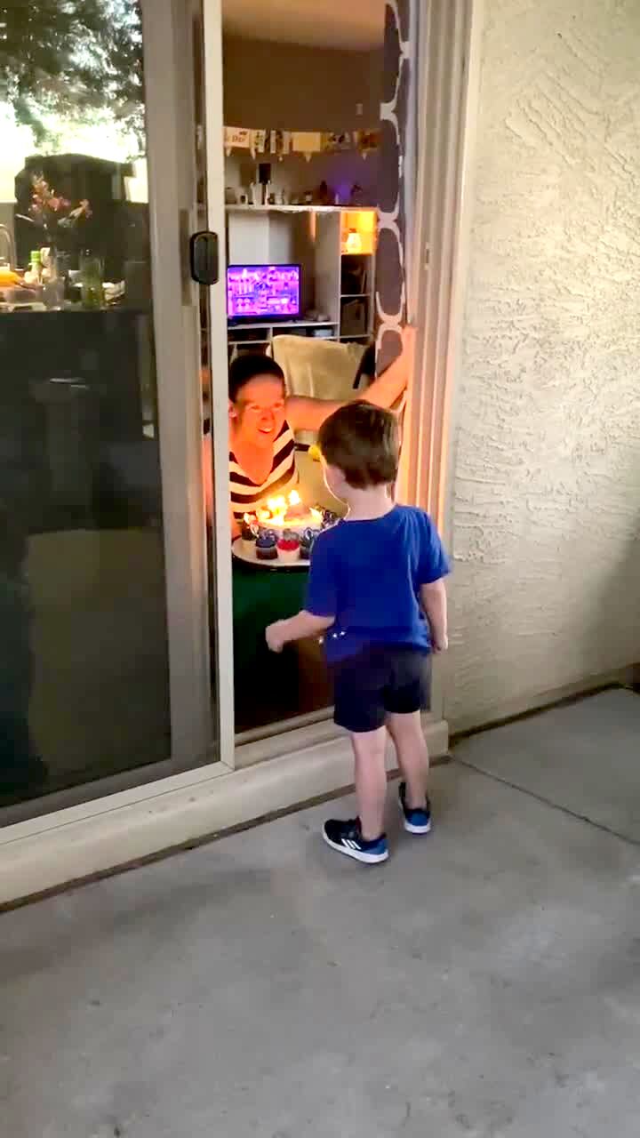 A woman holds a plate of birthday cupcakes out to a young boy to blow out the candles when the family dog runs out the door and knocks it out of her hands.