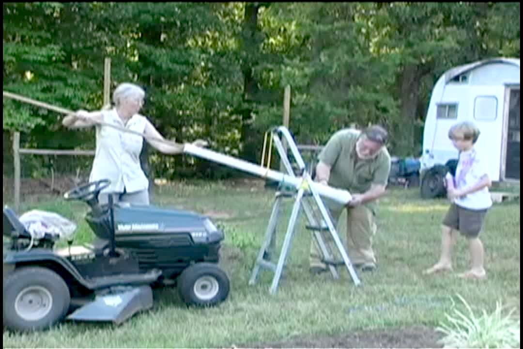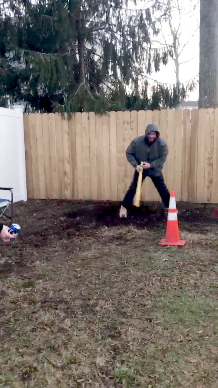 A man breaks off the bottom part of a storm drain in the yard to get a squirrel out. The squirrel tries to crawl back up it but the man stops it and then the squirrel runs towards the woman who records the video and the woman screams.