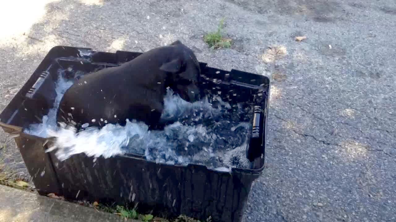 Two young boys look up the fireplace and prod a squirrel into a laundry basket. The woman that films yells frantically as they try to get the critter out the door.