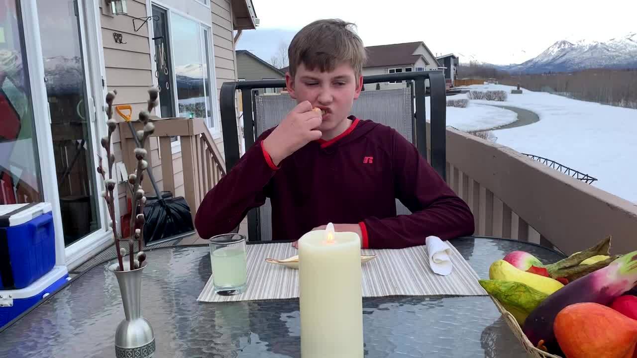 A woman screams when a chipmunk jumps on her while she is holding food outdoors.