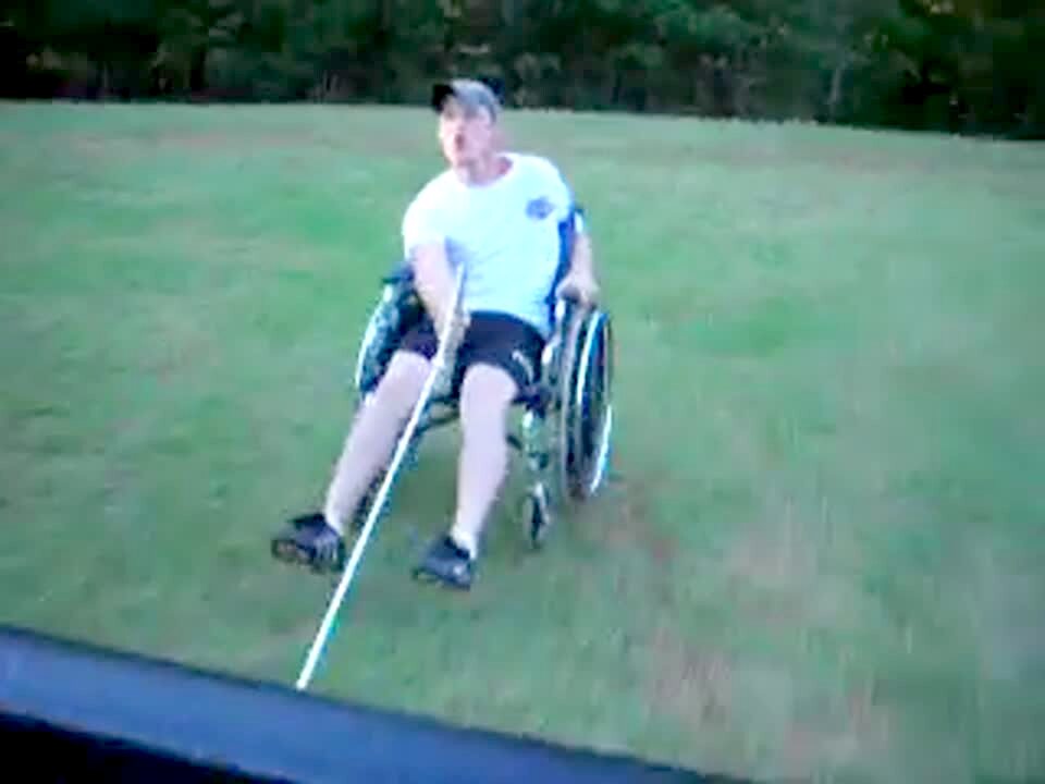Man sits in a wheelchair gets pulled behind a car very fast. Man lets go of water skiing rope, rides across grass, hits a fence & flips out of chair. Far away & hard to see b/c car goes fast. With recovery. Family BBQ.