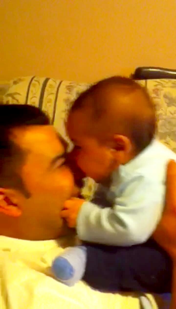Tot boy is playing with his dad before bedtime. Boy starts coughing & suddenly vomits all over dad. Dad screams & boy laughs. Dad turns to camera & has brown puke all over him. Throw up. Gross.