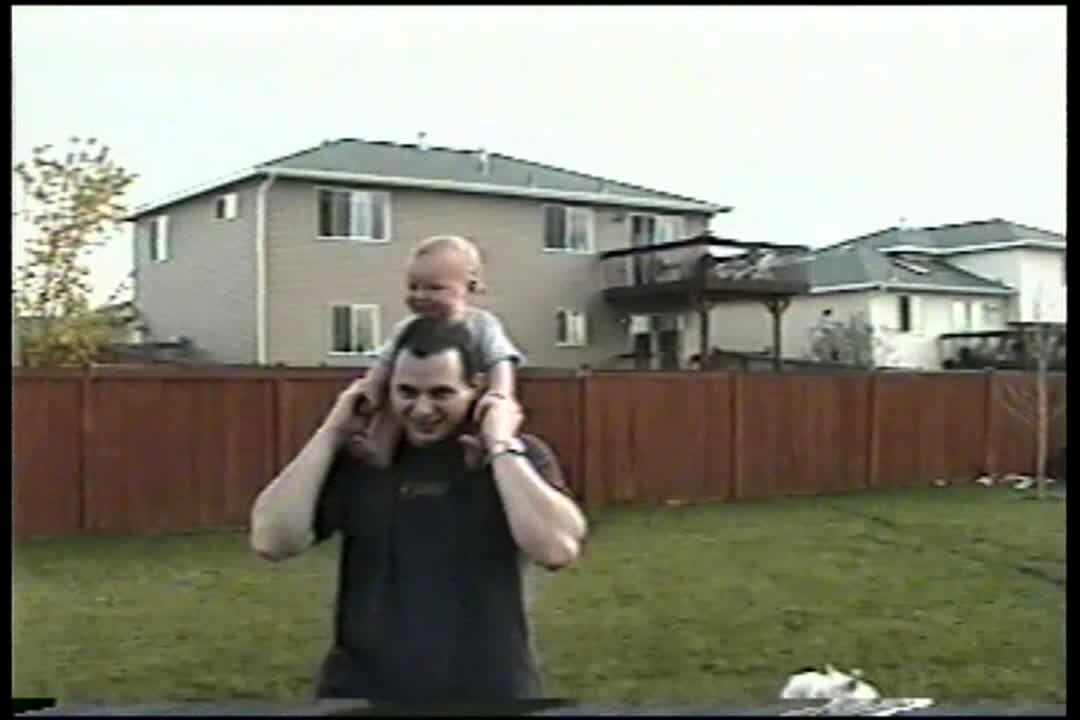 Dad bounces baby on his shoulders. Baby throws up on dad's head. Puke, vomit