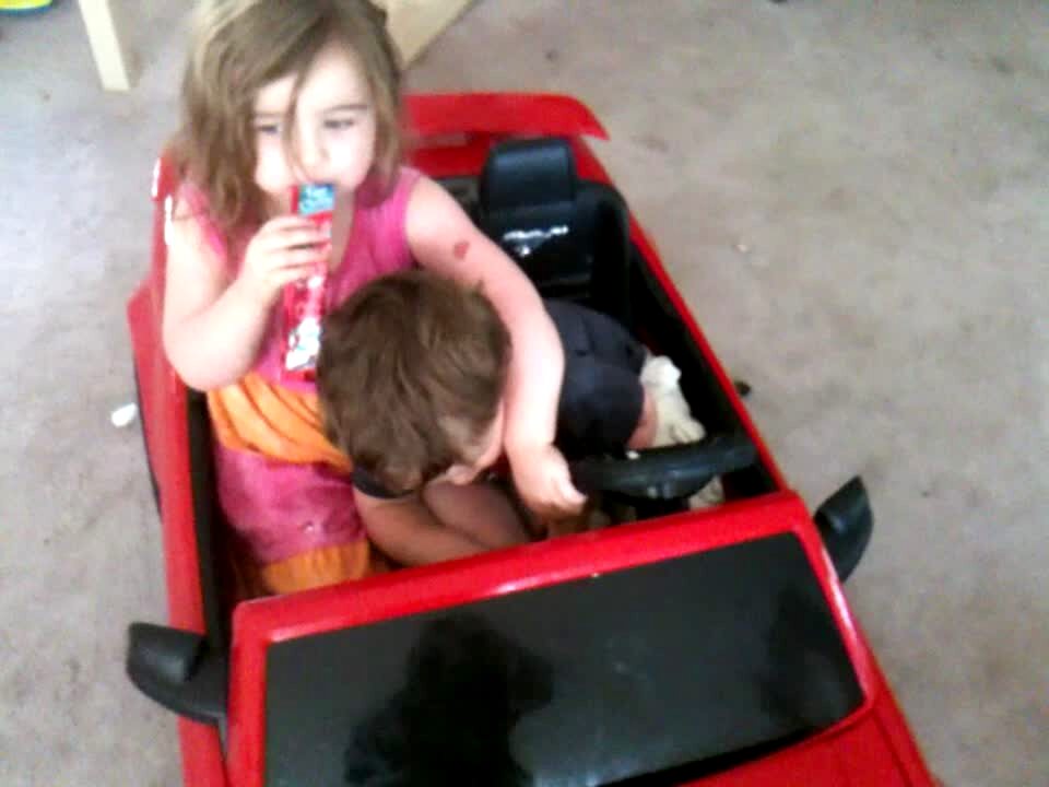 A boy instructs his tot sister on how to drive a power wheels car while he rides behind her in a trailer wagon, then hops into the car to push the gas for her when she can't figure it out. He steps back into the wagon when she hits the gas and he falls out and gets run over.