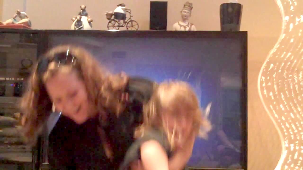 Dad films little boy & girl riding a red Power Wheels car in the garage. They run dad over & he screams "owww". Siblings