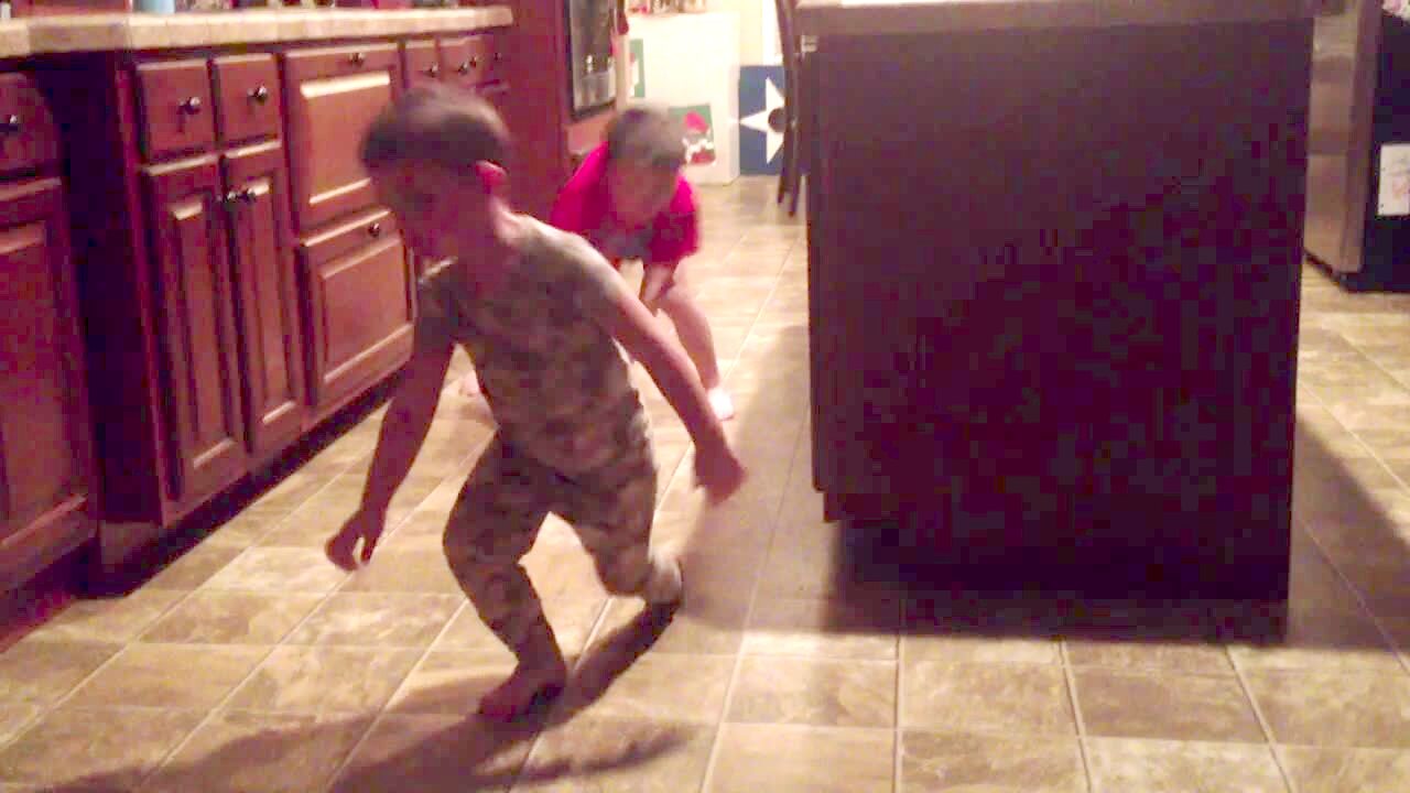 A little boy rolls a toy car in a kitchen and hits another boy in the groin.
