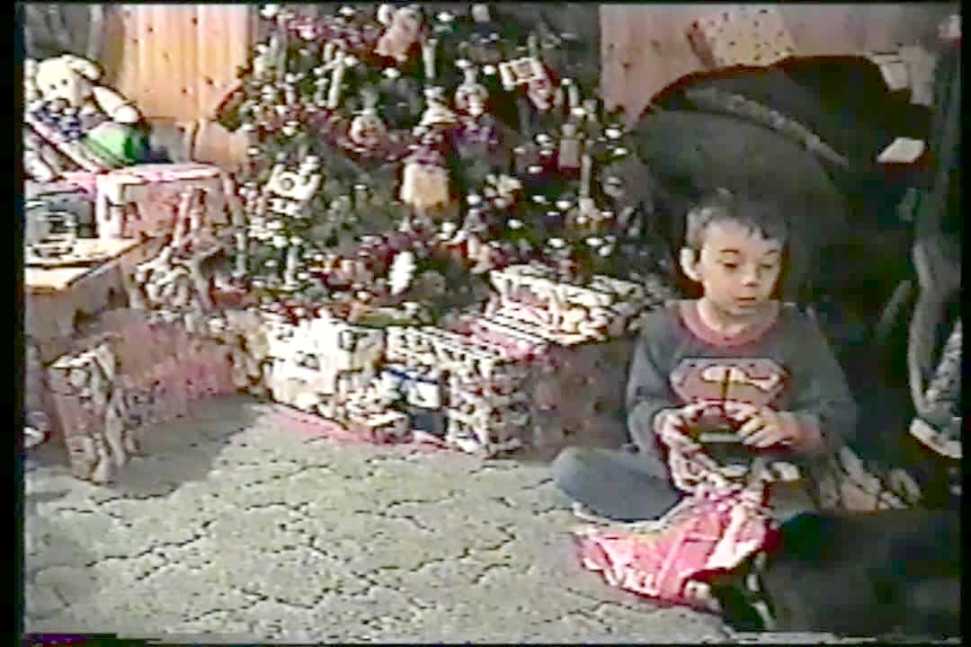 YOUNG BOY'S REMOTE CONTROL triggers CAR AND IT BURSTS OUT OF THE WRAPPED CHRISTMAS PRESENTS. hE'S SURPRISED.