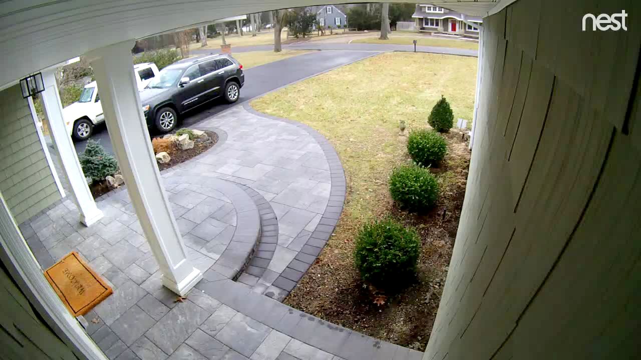 A woman slips and falls down the icy porch stairs and a car honks at her. Security footage.