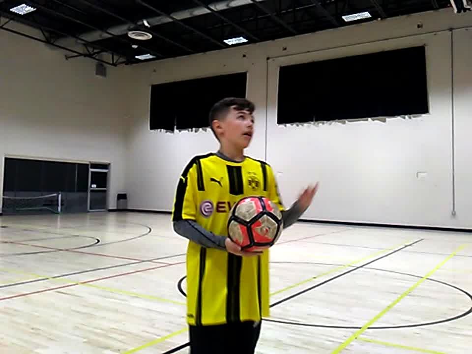 A young boy tells the camera what he is going to do. He is in a gym. He has a soccer ball. he is going to kick the ball to the ceiling. He goes to demonstrate. The ball gets stuck on something on the ceiling. The other boys with him laugh. The boy who kicked the ball is confused.