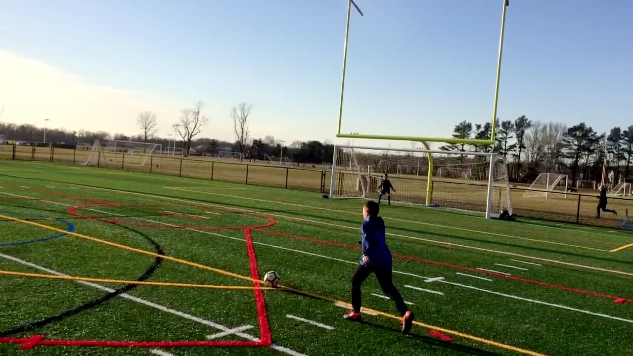 A boy kicks a soccer ball at a goal on a field and the ball bounces off the pole and hits the boy who plays goalie in the head. Featured talent cleared only (the two boys playing soccer).