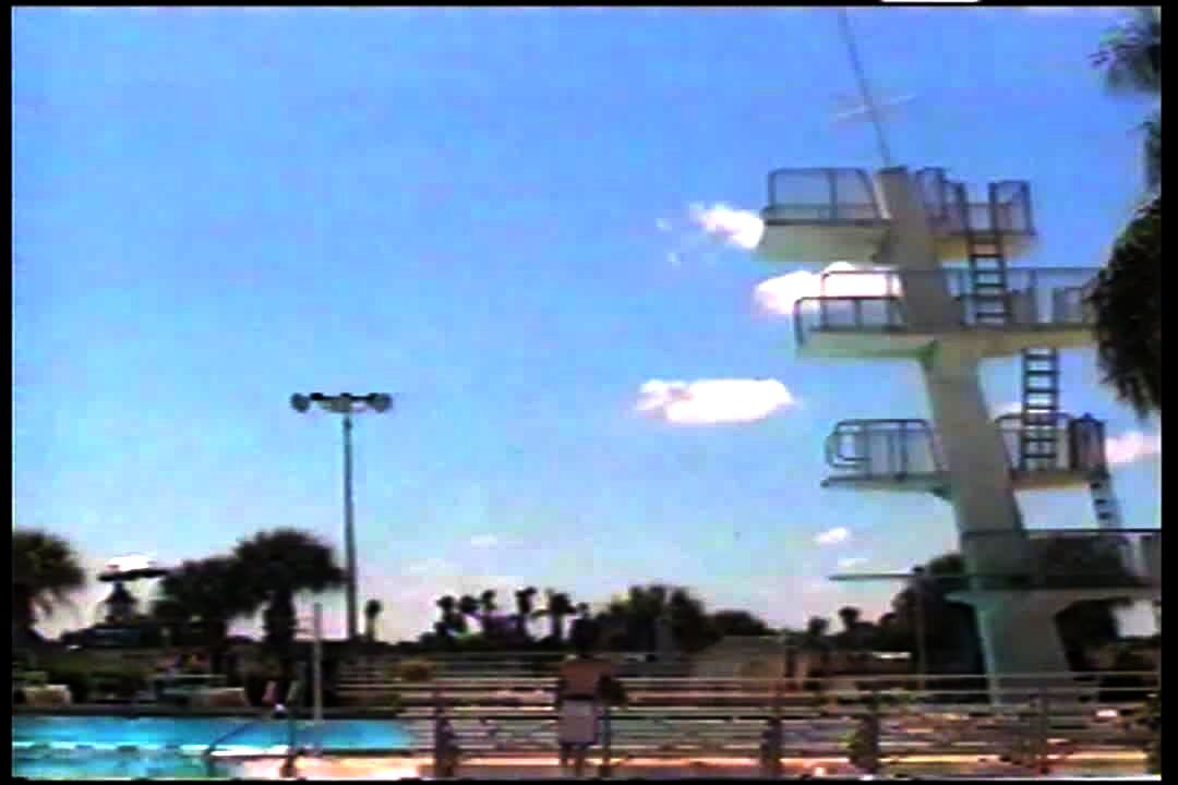 A young boy jumps into a pool, then an inner tube flies onto a senior woman's head in a yard. Security footage.