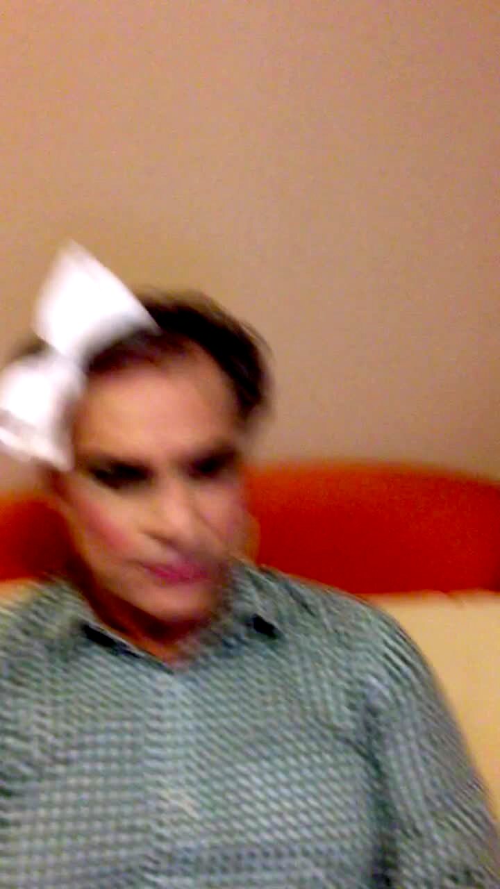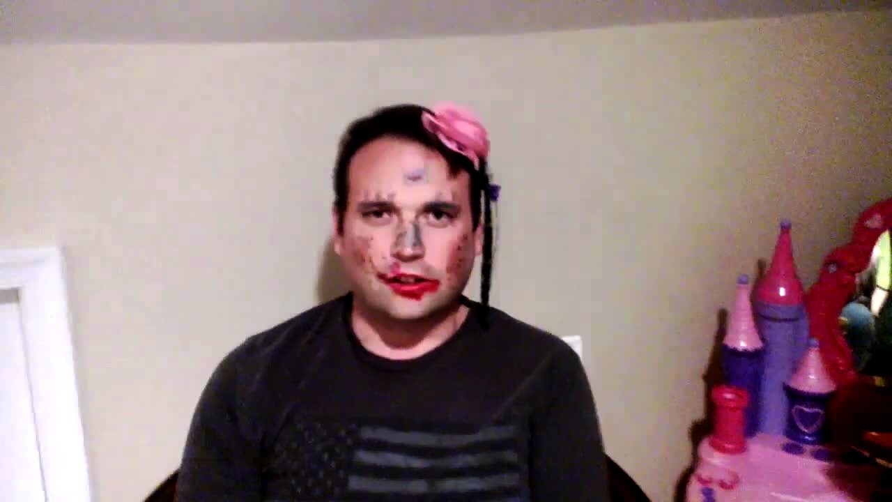 A man wears fake hair and make-up and films himself indoors before his daughter reveals that the fake hair is actually hers as she hides behind her dad. AA: Makeup your dad.