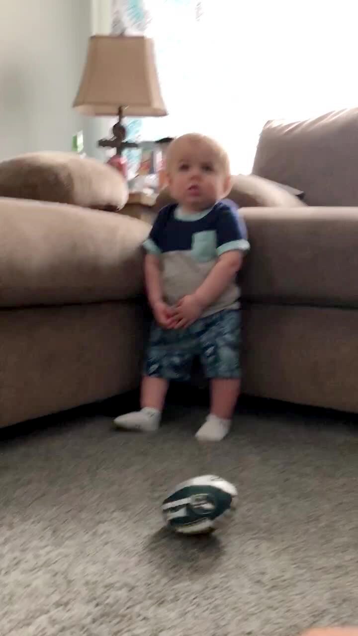 A man throws a ball at his tot son repeatedly. The boy doesn't move and the ball bounces off him.