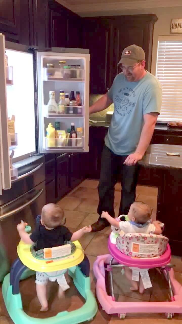 A man opens a refrigerator and a baby girl and baby boy walk up to it in their walkers.