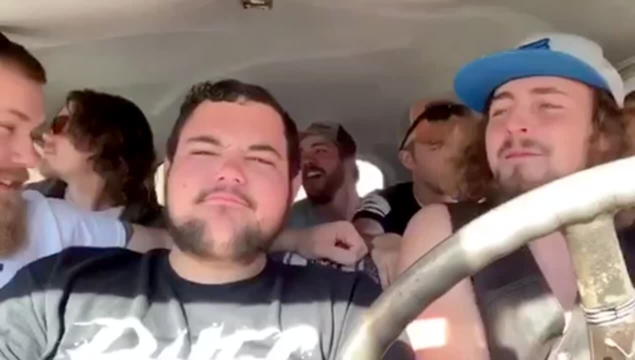 A senior man rides a hover board very slowly down a carpeted hallway. At 1:18 he has a slow but dramatic fall. He hits his head on a coffee table as he goes down. He curses as he falls and gets up.