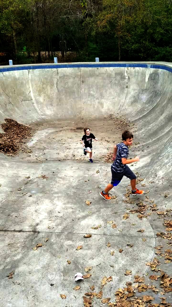 Two young boys run in an empty pool. Their father gets in the pool and falls down as he prepares to run up the side of the pool.