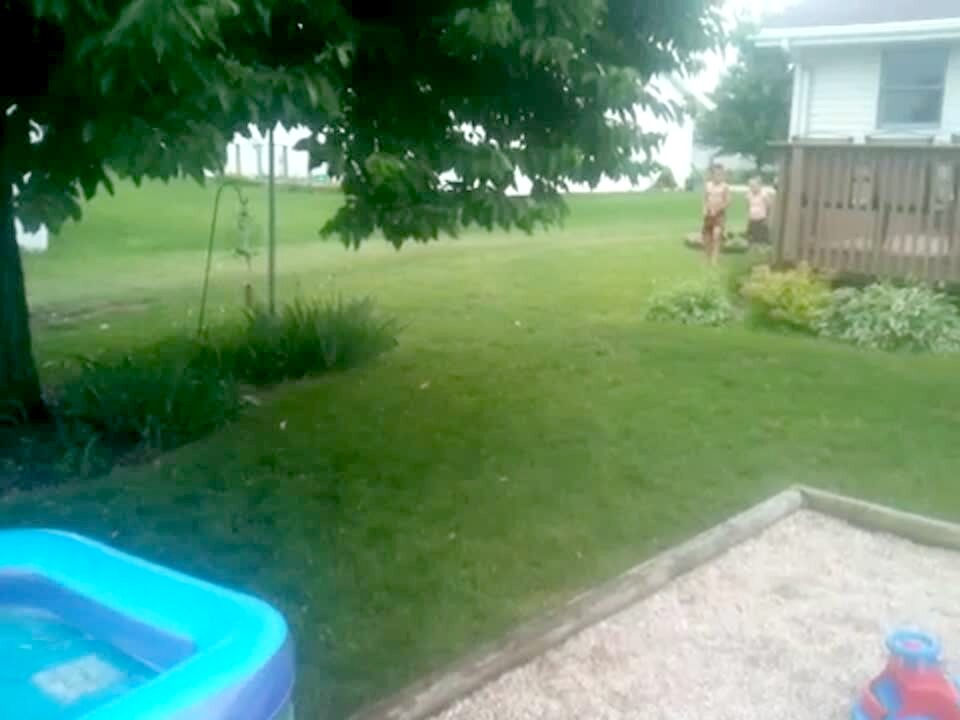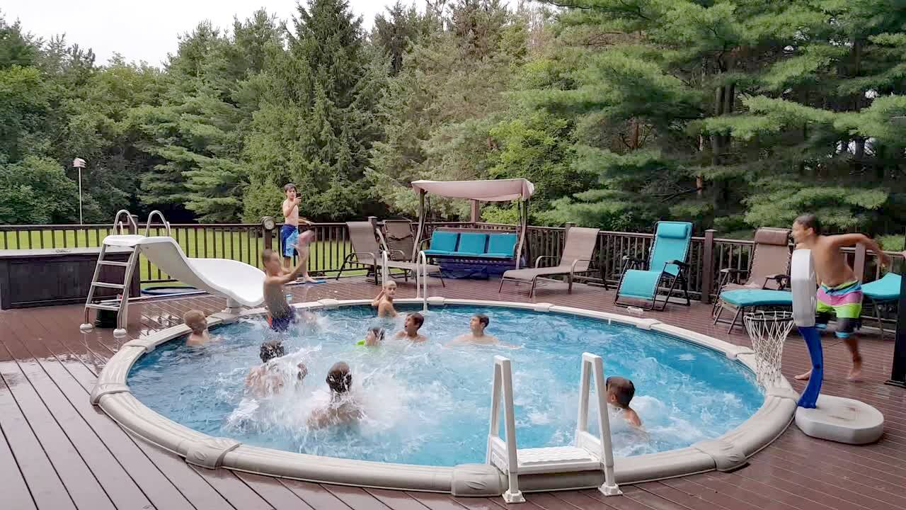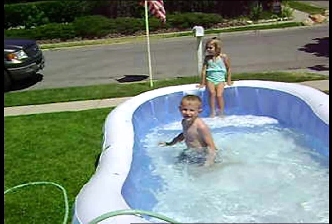 Two teen boys stand in front of a kiddie pool in the yard and a man runs at them from behind to push them in the water. The kids get out of the way and the man trips over the wall of the pool and falls in the water. Security footage.
