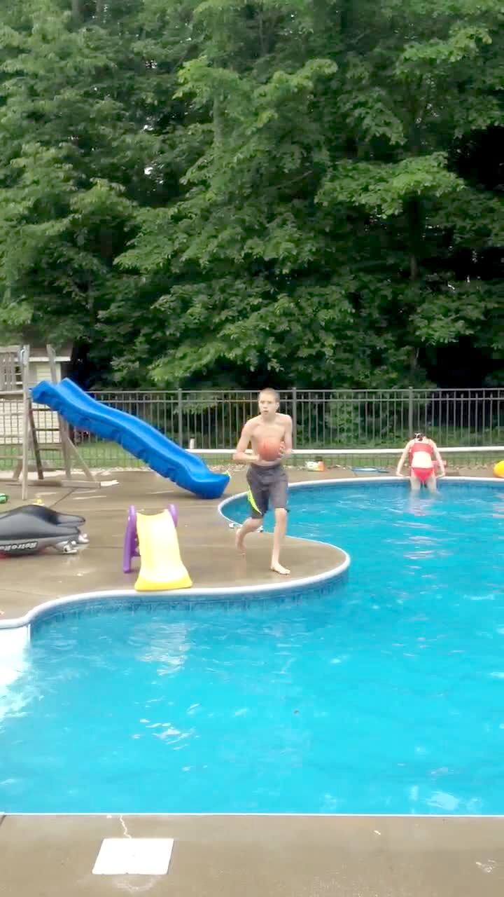 A series of boys pass a ball to one another before jumping into a swimming pool outdoors and the last boy to jump in throws it into a basketball hoop.