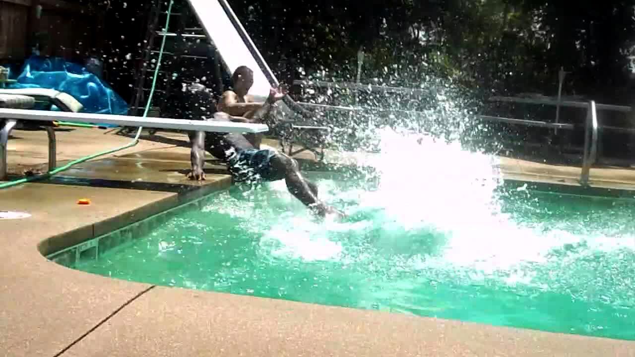 Group of kids and teens get ready to jump into a pool. Boy slips and bounces off of diving board