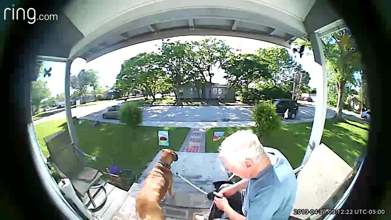 Tot girl sits on a stool in front of the door. When the stool begins slipping, she gets funny wide eyed look on her face until Dad helps.