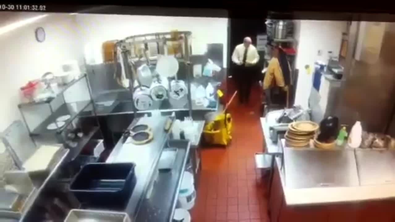 A man hits two trays together and scares a woman when she walks into a restaurant kitchen then she trips over a bucket.