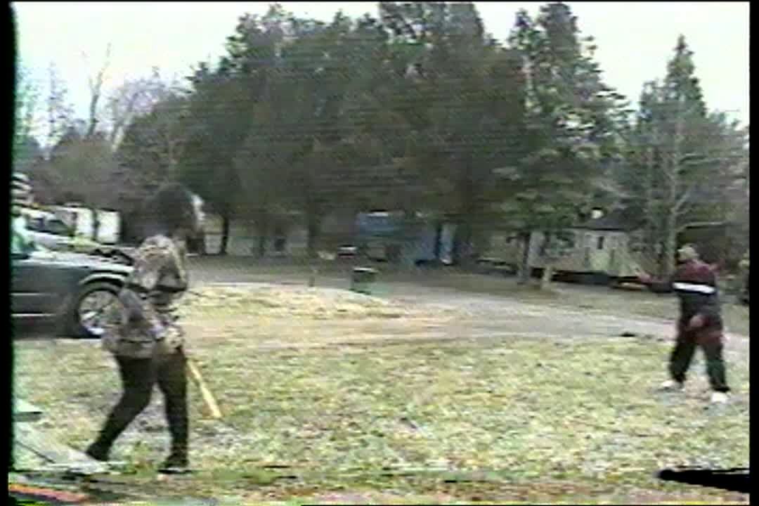 A woman throws a ball that explodes to a man with a baseball bat for a gender reveal in the yard. Her husband hits the ball and part of it hits his wife in the back and she falls.