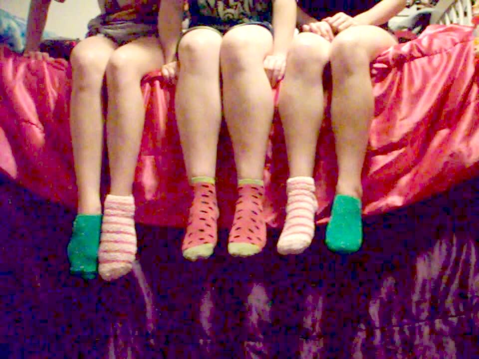 Three teen girls with colorful socks tape only their legs moving to music. They sit on a bunk bed, which breaks.