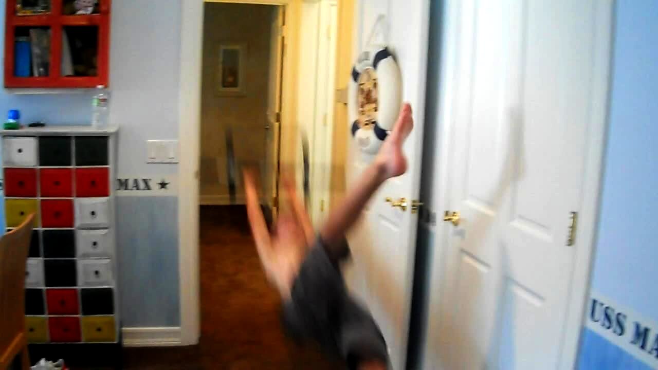 A German shepherd puppy jumps off of a living room couch, but the dog hits his face on another part of the couch. Security footage.