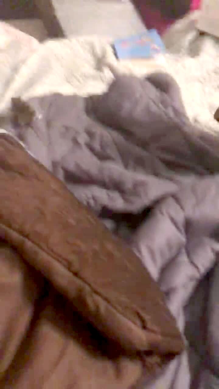A black lab dog and a shih tzu cuddle and make noises on a couch indoors before they both realize they're being filmed and stop to look at the camera, then resume wrestling.
