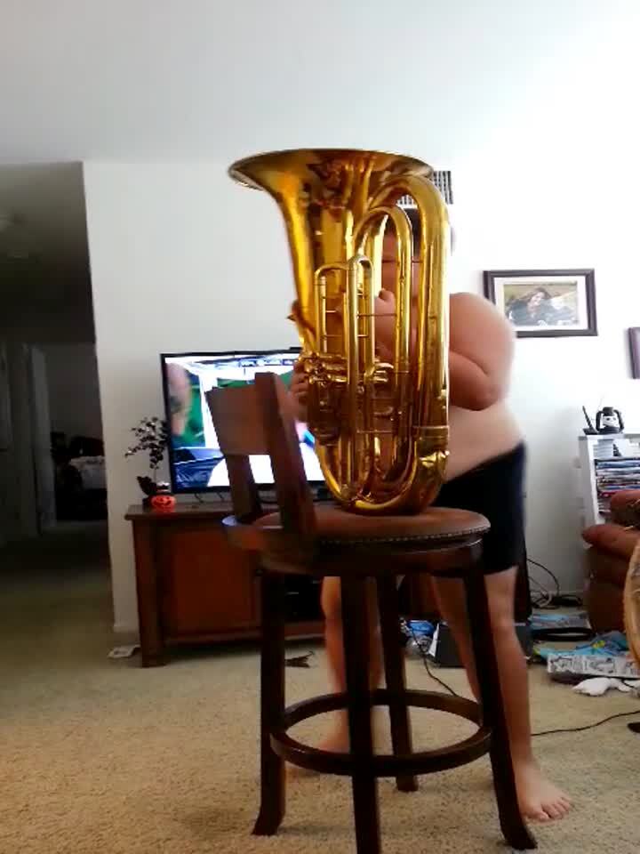 A young boy plays a Tuba in his underwear while his mother sings "Tiki Room."