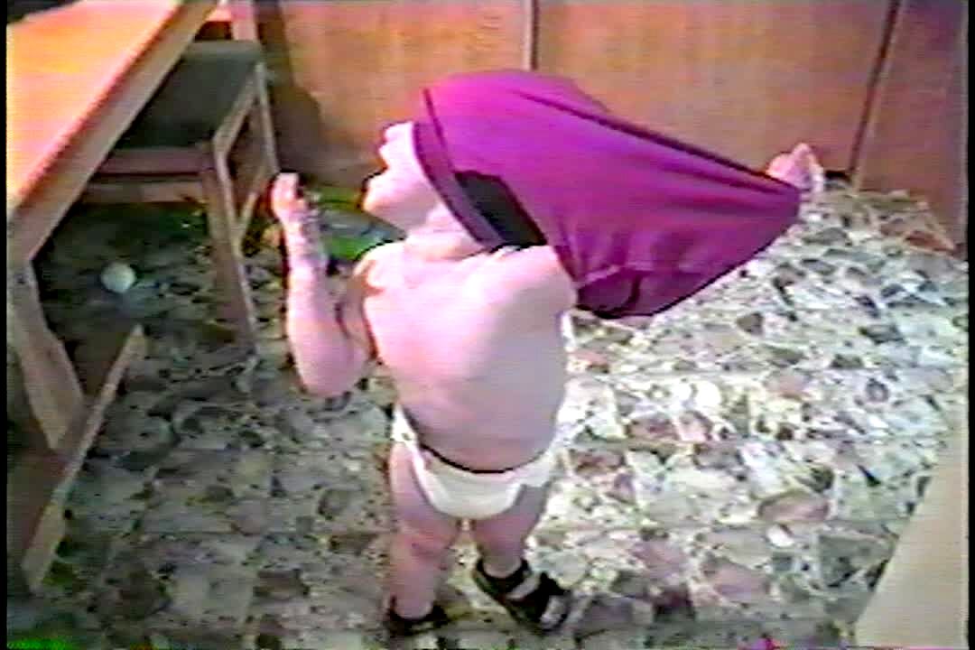 Tot boy is stuck in his shirt.