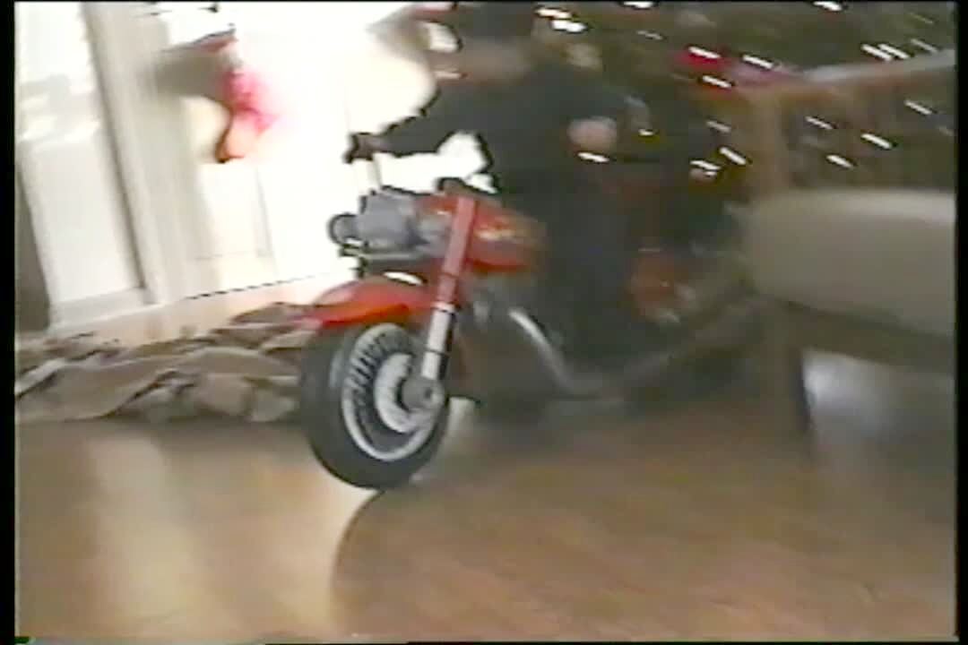 A young boy accidentally breaks his tot sister's dollhouse when he drives in to it with the toy power wheels motorcycle he got for Christmas.