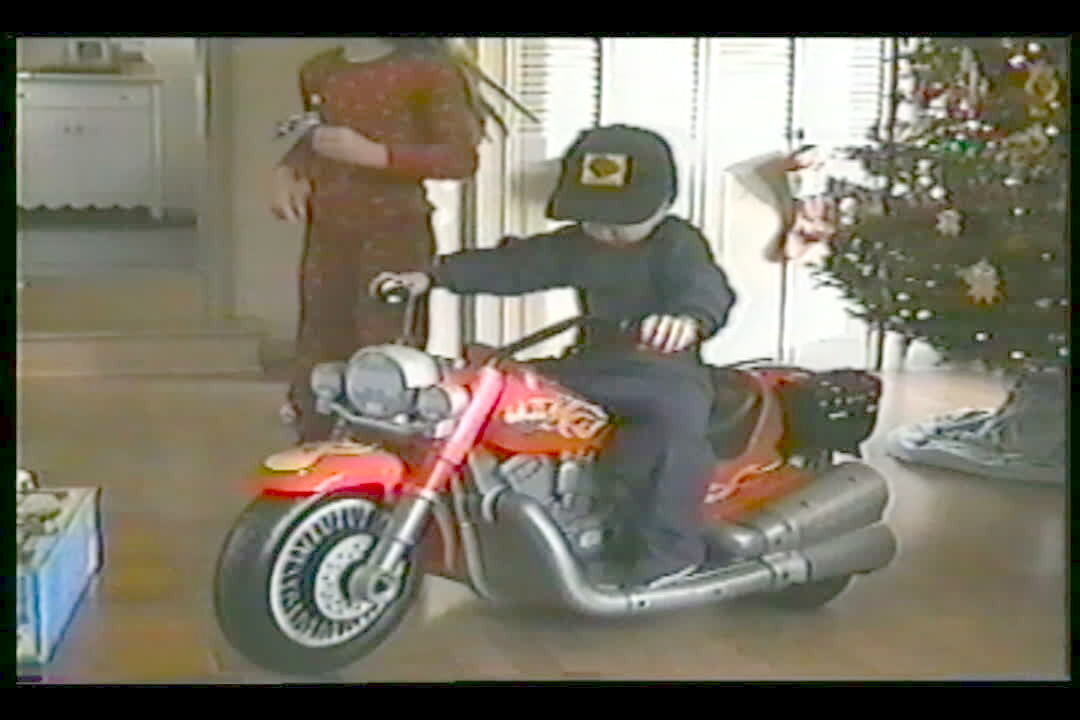 Tot boy gets toy motorcycle for Christmas, drives it backwards into Christmas tree
