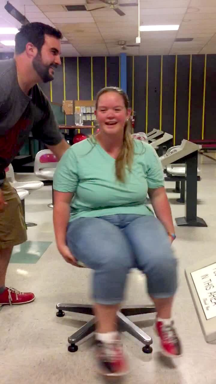 A woman plays piano while her dog lays its head on her foot pedal as it bobs up and down with her foot.
