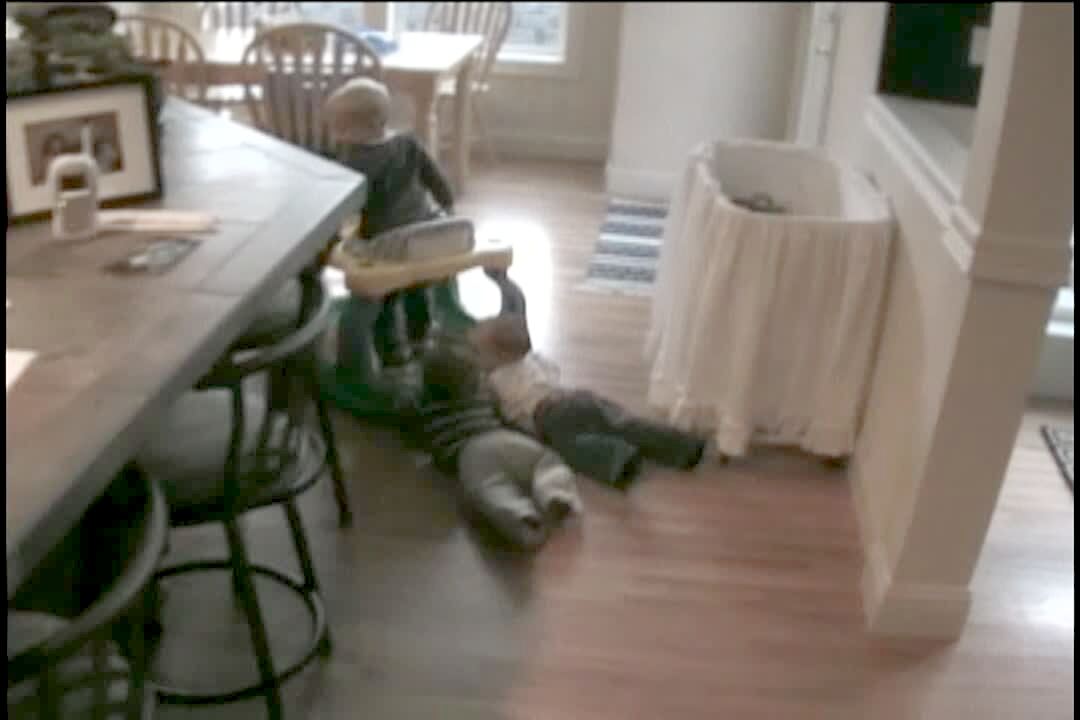 A tot boy drags his baby brother along the floor by the leg of his pajamas indoors.