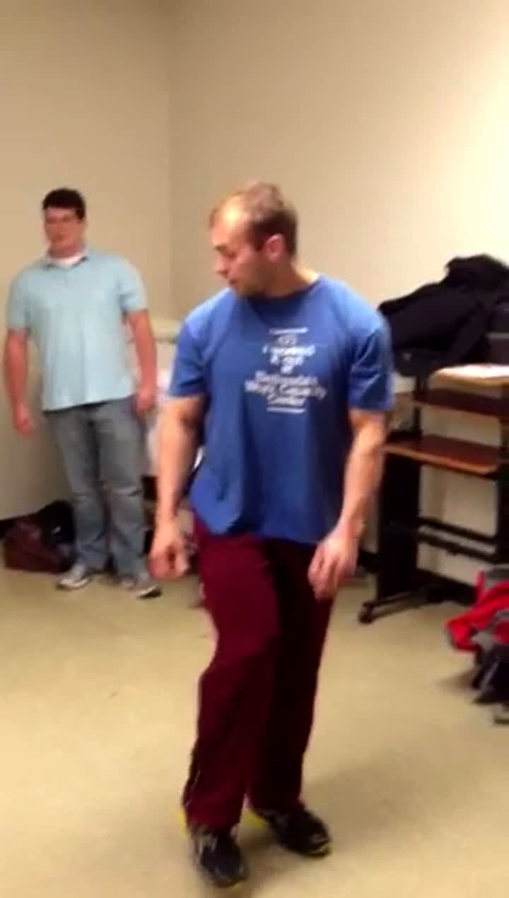 Man stands on a floor buffer in the house and spins around. He falls off. No tails.