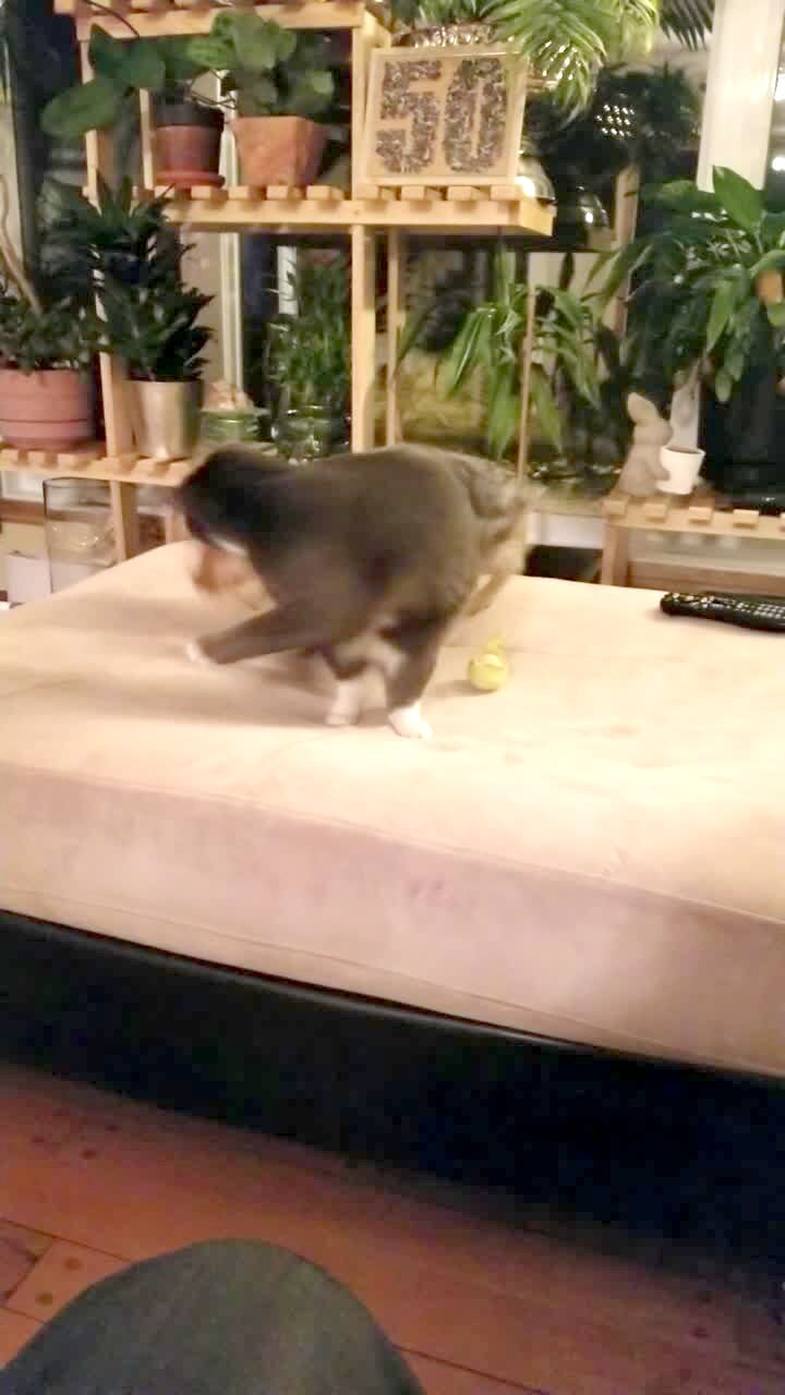 A teen boy and his younger brother and sister set up an elaborate course for a ping pong ball in their house, and the ball goes through the course without a hitch until their cat catches it at the top of the stairs. The cat then drops the ball and it bounces into the bowl at the bottom as intended, and the siblings freak out.
