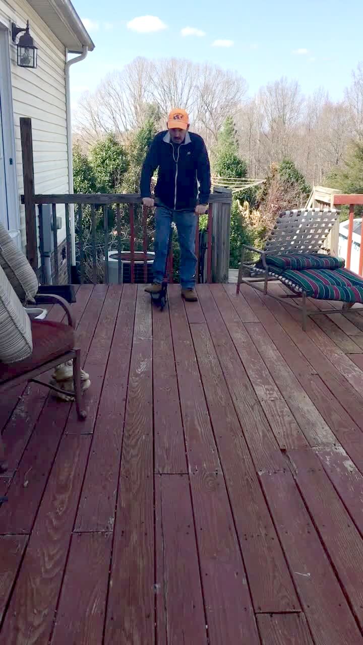 Man rides a moped off a homemade jump / ramp and falls on the driveway.