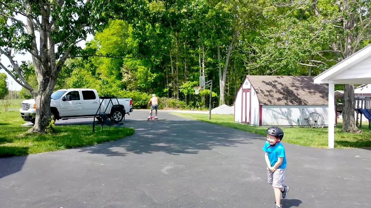 A man rides a scooter along a sidewalk and then goes up his driveway and crashes into a parked car.