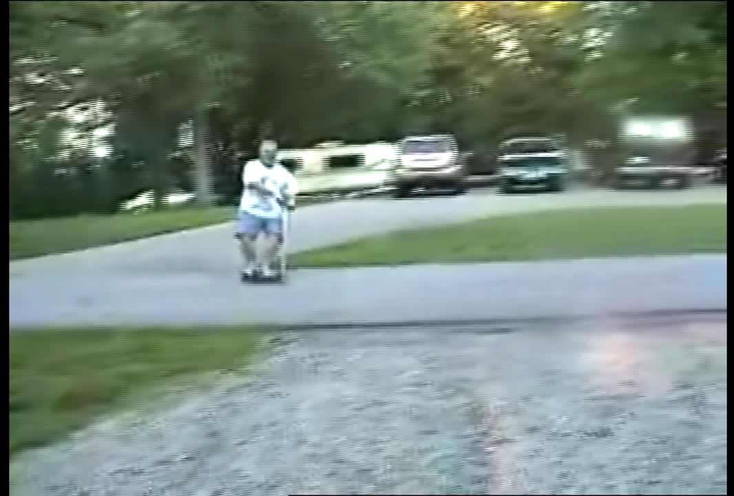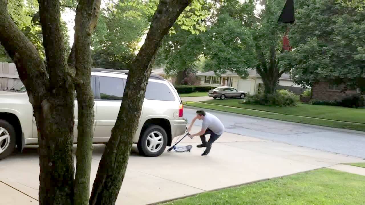 A man rides a scooter down a driveway, then he falls and throws the scooter behind him.