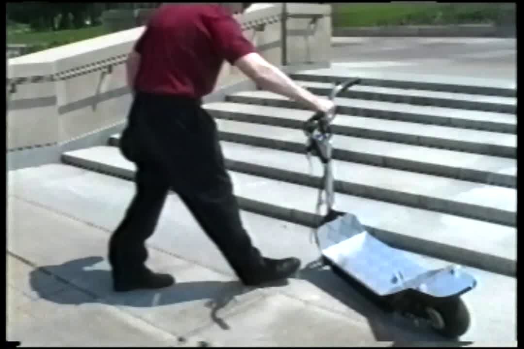 A woman crashes a Segway scooter onto a curb outdoors, steps down, it spins around her and she falls over. She asks the man who owns it if it took him a long time to figure it out when he got on it and he says "no."