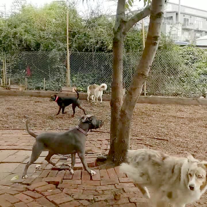 A Boxer dog and a Beagle dog run around in a playground park and the Boxer dog hits the Beagle dog and the Beagle dog flips and falls down.