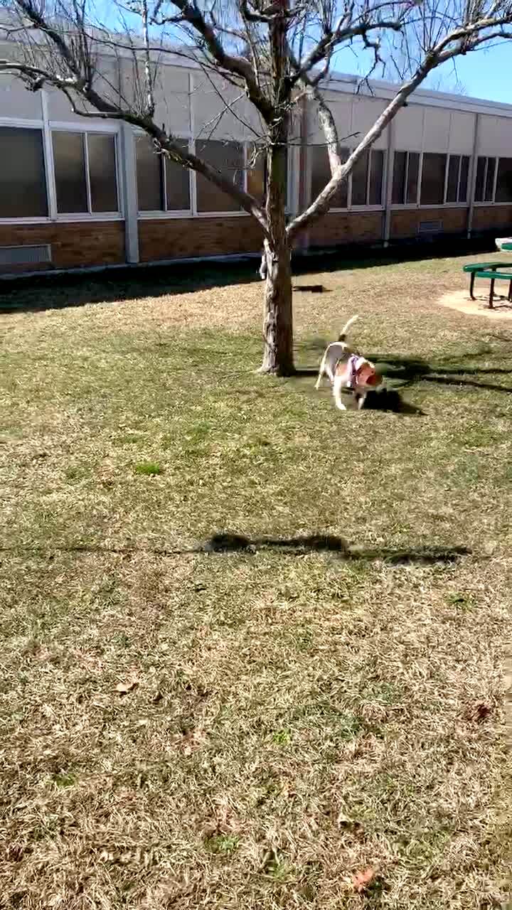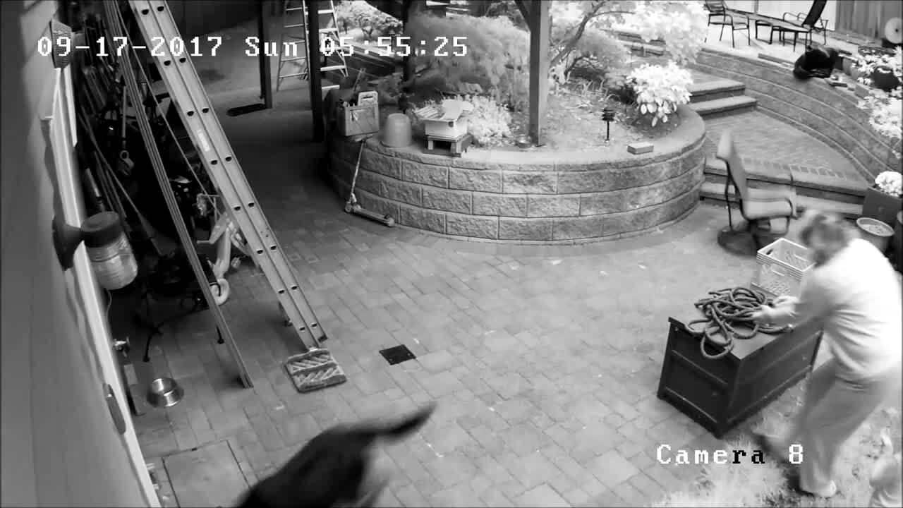 Security camera footage of a dog that runs away from a chair that seems to move on its own. The dog's unseen leash is stuck on the chair. No audio.