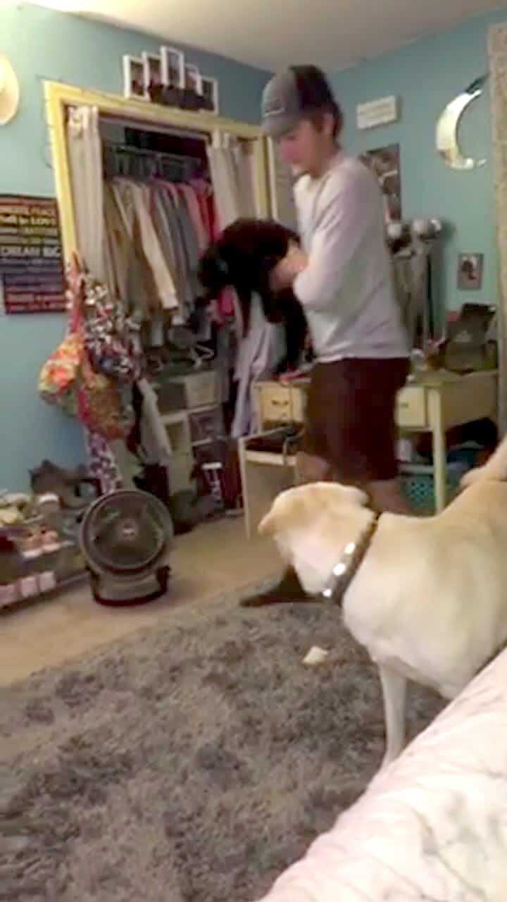 A man drops a cat on the floor and the cat immediately jumps back onto a bed.