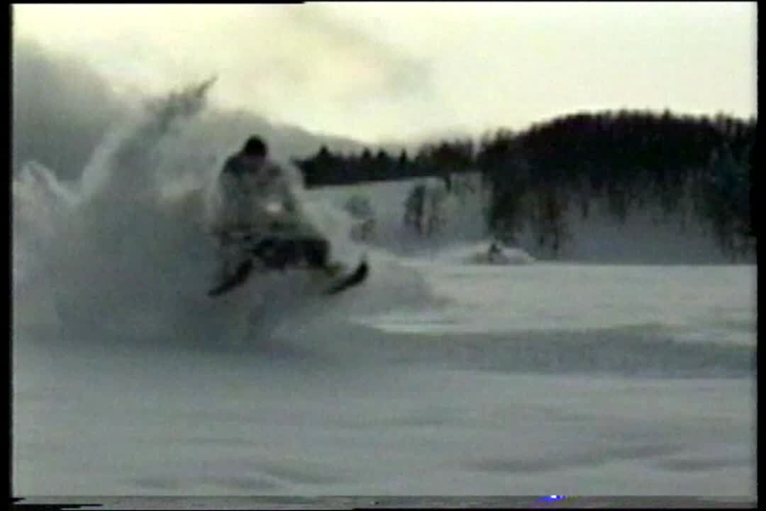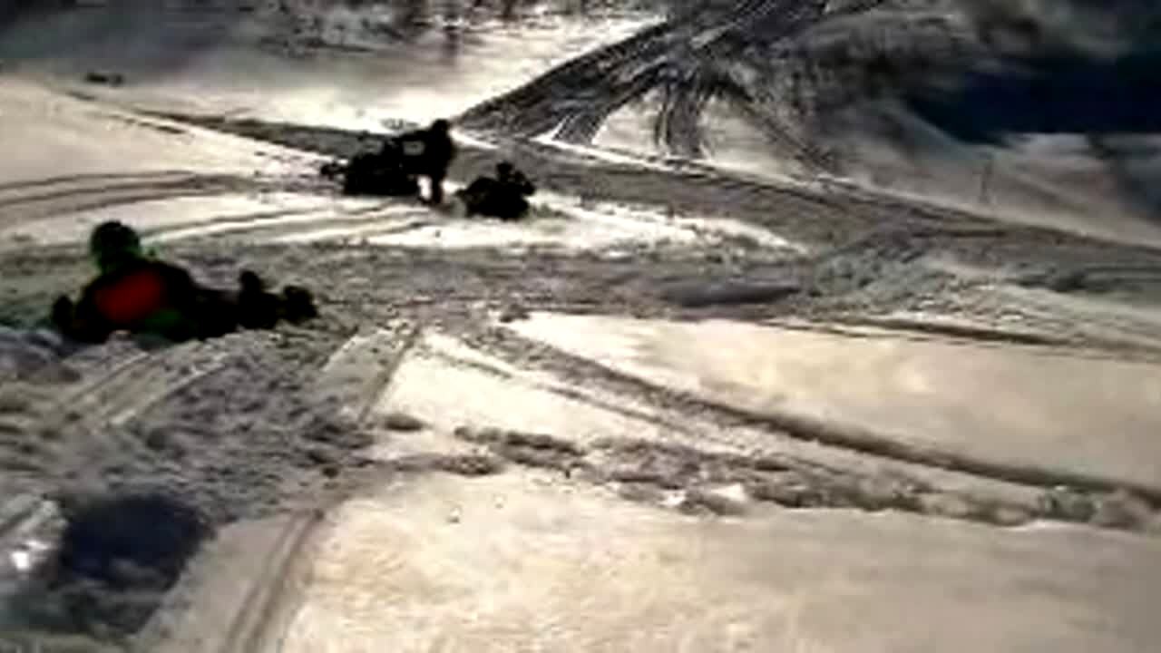 SNOW MOBILE. Man takes spectacular fall off snowmobile, says "what the hell?!"